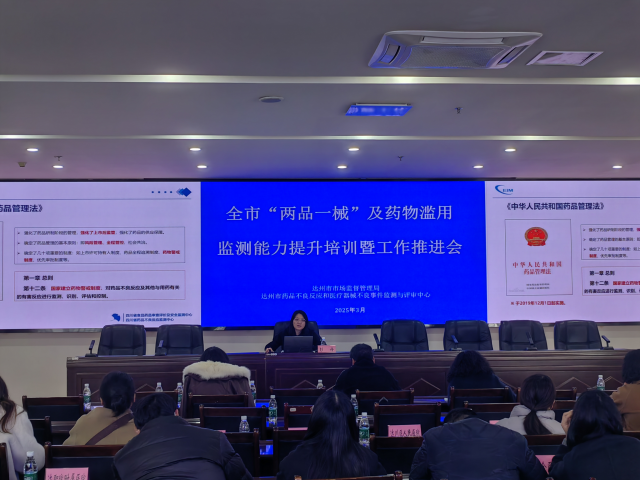 3月20日,达州市市场监管局组织召开2025年全市“两品一械”及药物滥用监测能力提升培训暨工作推进会。市市场监管局党组成员、副局长郑渠出席会议并讲话,市卫健委、市公安局、市医保局、市中医药管理局相关科室负责人,市局药品、医疗器械、化妆品监管科室负责人,市中心全体人员,9个县(市、区)市场监管局分管领导、股室负责人及省级药械化哨点医院、二级以上医疗机构、药物滥用监测单位分管领导及工作人员共150余人参加会议。