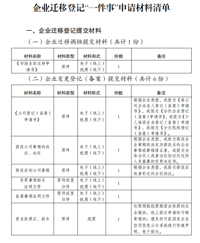 企业迁移登记“一件事”申请材料清单 (提交材料)