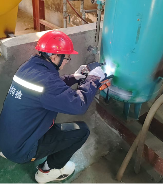 针对冻库低温、高湿环境下设备易出现的腐蚀、密封失效等典型问题,检验人员运用超声波测厚仪、磁粉探伤仪等专业设备,对压力容器本体、安全附件、连接管道等关键部位开展“全覆盖”检验排查,同时逐一核查设备定期检验记录及安全管理制度执行情况。本次检验共排查出安全隐患6处,现场指导企业当场完成3处立行立改,针对压力管道复杂隐患出具专项整改意见书,并同步建立跟踪督办机制。